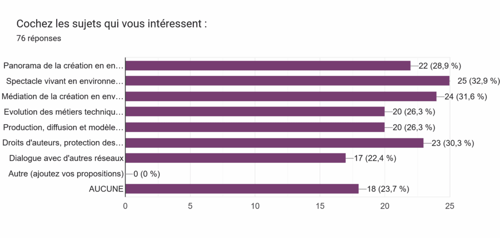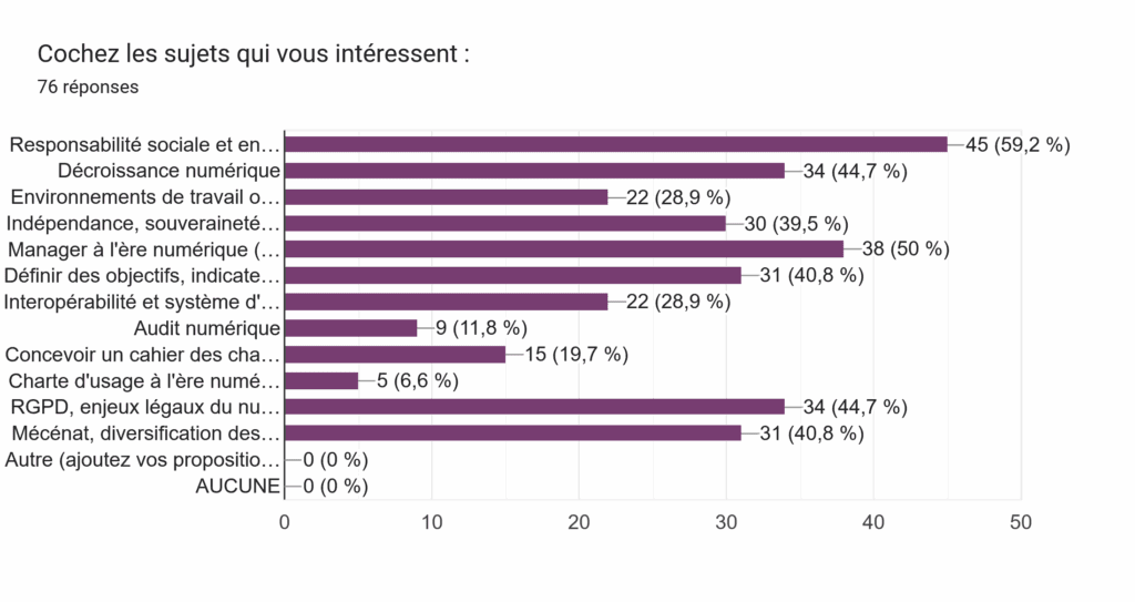 Au TMNlab, c’est la dynamique collective qui fait les sujet. N’importe quelle personne au sein de la communauté peut initier et porter un sujet en le soumettant au collectif et en fédérant un petit groupe de discussion ou de travail. A travers ce type de sondage mais également tout au long de l’année dans la mailing list, le Discord et lors des événements, nous facilitons l’émergence de vos sujets, pour vous et par vous même. [aller plus loin : Boîte à outils / Groupe de travail / Organiser un événement TMNlab, petit ou grand]