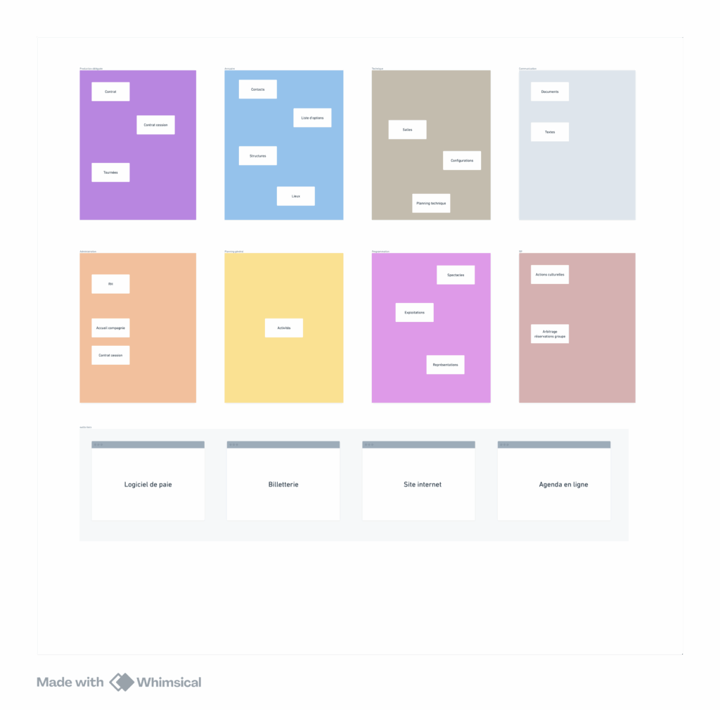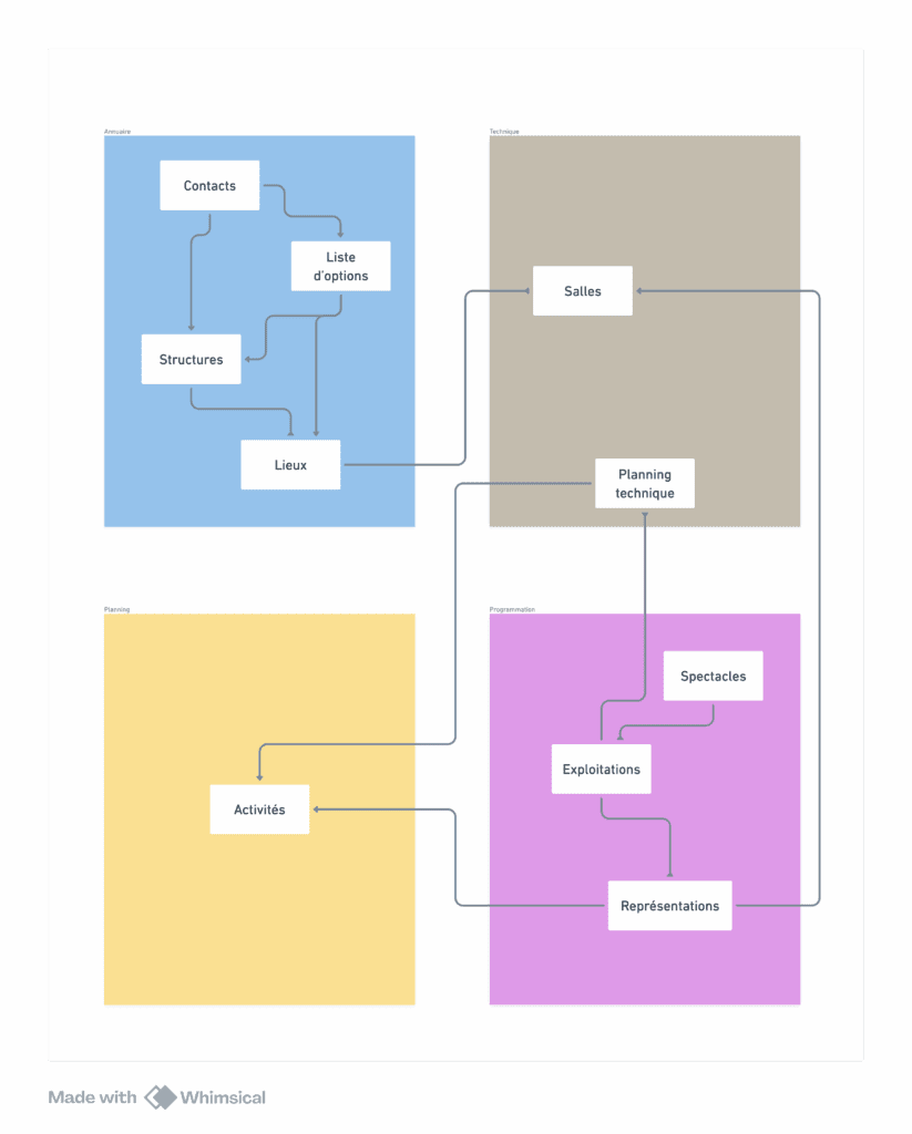 - Et ainsi de suite : Notre exemple s’est arrêté à ce partage mais il est bien évidemment possible d’étendre les application à d’autres pôles. Les relations publiques qui gère les représentations avec des dispositifs d’accessibilité, des actions de médiations en lien avec l’accueil d’un spectacle, l’administration qui génère une feuille de route agrégeant toutes les informations issues des différents pôles…