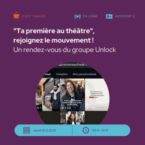 Ce Café TMNlab du 18 décembre a présenté les enseignements du projet Unlock Théâtre (lauréat SNI 2024 – Ministère de la Culture) et, surtout, l’outil opérationnel qui en est issu : #tapremiereautheatre, un format simple et réplicable pour aller à la rencontre de personnes peu ou pas familières du théâtre, recueillir leur “image du théâtre” avant la sortie, puis leur retour après l’expérience. Les retours des équipes engagées ont confirmé l’intérêt du dispositif pour toucher prioritairement les 25–40 ans, travailler autrement Instagram (comme espace de médiation et de sociabilité), et renforcer les coopérations entre relations avec les publics, communication et billetterie. Ils ont aussi mis en lumière des points de vigilance très concrets (recrutement et no-show, conduite d’interview, binôme technique/interview, suivi RP, choix des mots et limitation du jargon), désormais intégrés dans une mallette “Do it yourself” et une boîte à outils prêtes à l’emploi.