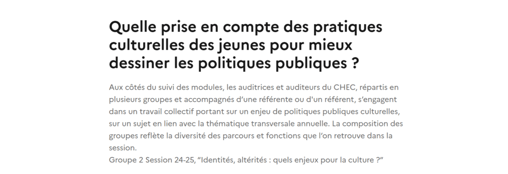 C’est la question que se sont posée les auditeurs du Cycle des Hautes Etudes de la Culture (CHEC) du groupe 2 de la session 2024-2025. Répartis en plusieurs groupes qui reflètent divers parcours et fonctions, ils ont mené un travail collectif encadré par une référente autour du sujet : “Identités, altérités : quels enjeux pour la culture ?”.