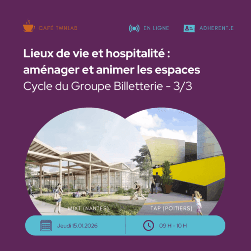 Pour explorer ces questions, le Groupe Billetterie du TMNlab vous a donné rendez vous jeudi 15 janvier pour un dernier cycle avec Emmanuelle Corson, responsable de l’animation du site et lieu de vie, chez Mixt, Terrains d’art en Loire-Atlantique, Maud Anginieur, responsable de l’action culturelle, et Véronique Salmonie, directrice de l’accueil-billetterie, du TAP – Scène nationale de Grand Poitiers.