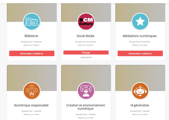 - Groupes de veille thématique : créés par l’équipe salariée pour permettre aux membres de se réunir autour d’intérêts communs, d’être notifiés de la veille associée (relai dans le groupe par l’équipe et les membres). Ces groupes peuvent devenir des groupes de travail si des membres souhaitent s’en emparer.