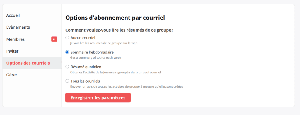 | Dans “Options d’abonnement par courriel”, vous pouvez choisir la fréquence à laquelle vous souhaitez recevoir un résumé de l’activité du groupe par email : – Aucun : aucune notification par email. – Hebdomadaire : un récapitulatif chaque semaine, envoyé le lundi à 12h – Quotidien : un résumé chaque jour, envoyé à 12h – Tous les courriels : une notification par mail à chaque activité sur le groupe. Vous pouvez modifier ces paramètres à tout moment selon vos préférences. ![]() |