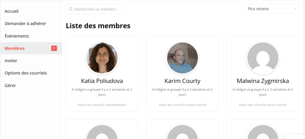 | Dans la section “Membres”, vous trouverez la liste de toutes les personnes inscrites au groupe. – cliquez sur un profil pour en savoir plus sur un membre. – vous pouvez échanger directement avec lui ou elle via la messagerie du profil. ![]() |