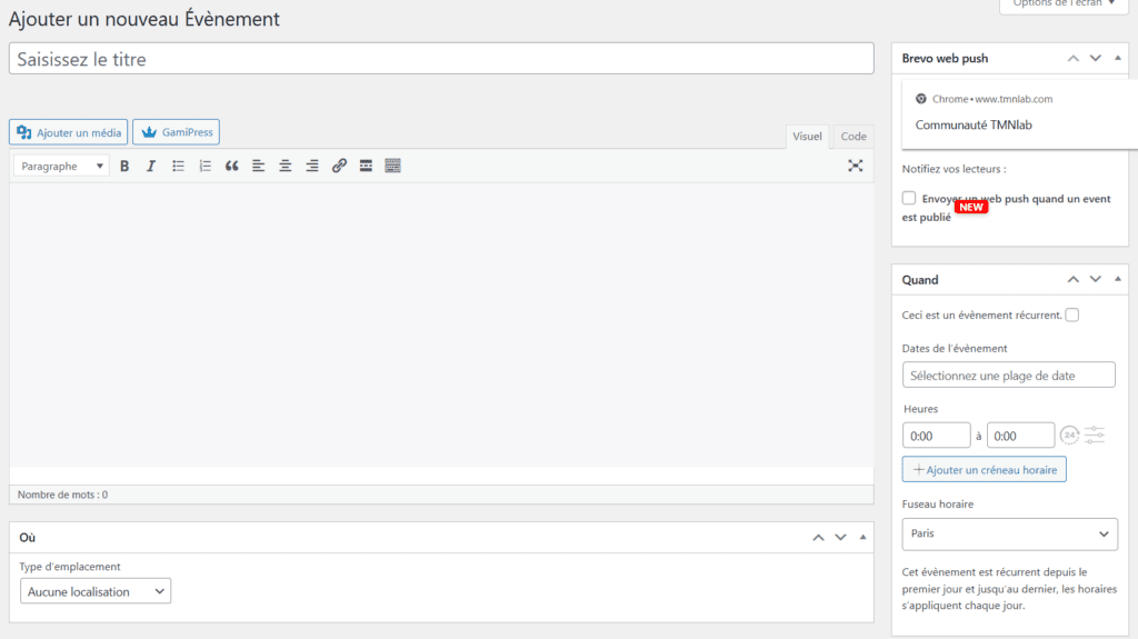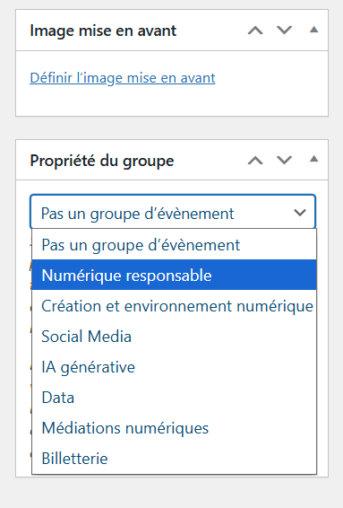 | Dans la section « Évènements », vous trouverez tous les évènements rattachés au groupe et son fonctionnement. Ils n’apparaîtront pas dans l’agenda général de la communauté. Pour créer un événement dédié au groupe : – allez dans la barre de navigation du site -> [Boîte à outil] sous menu [Publier un article, un événement] – cliquez sur [Ajouter un événement] – vous arrivez sur l’éditeur WordPress pour rédiger les informations de l’évènement ![]() – rattachez l’évènement à un groupe dans la section « Propriété du groupe » tout en bas à droite de la page ![]() – quand vous avez terminé, cliquez sur [Publier], par la suite un membre de notre équipe vérifiera l’événement avant sa publication. |