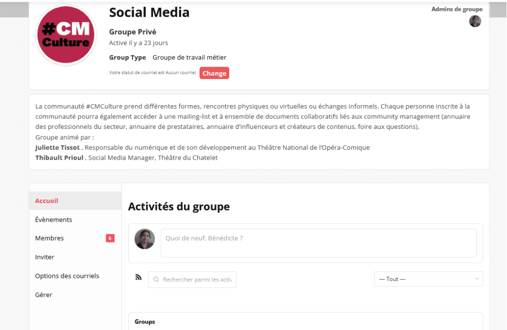 - Groupes de suivi de projet : créés par l’équipe dudit projet (salariés ou membres), ces groupes sont souvent temporaires