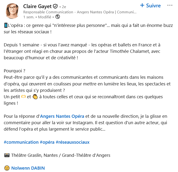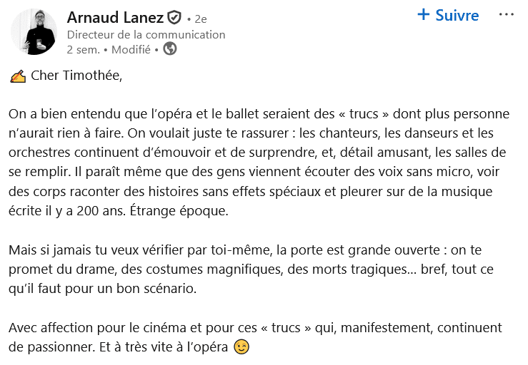 Dernièrement, l’acteur Timothée Chalamet a fait couler beaucoup d’encre avec sa déclaration « Tout le monde se fiche de l’opéra et du ballet ». On s’est réjoui des réponses d’Angers Nantes Opéra, de l’Opéra Grand Avignon et bien d’autres : l’opéra et le ballet sont bel et bien vivants et de nombreux spectateurs sont au rendez-vous prêts à le défendre.