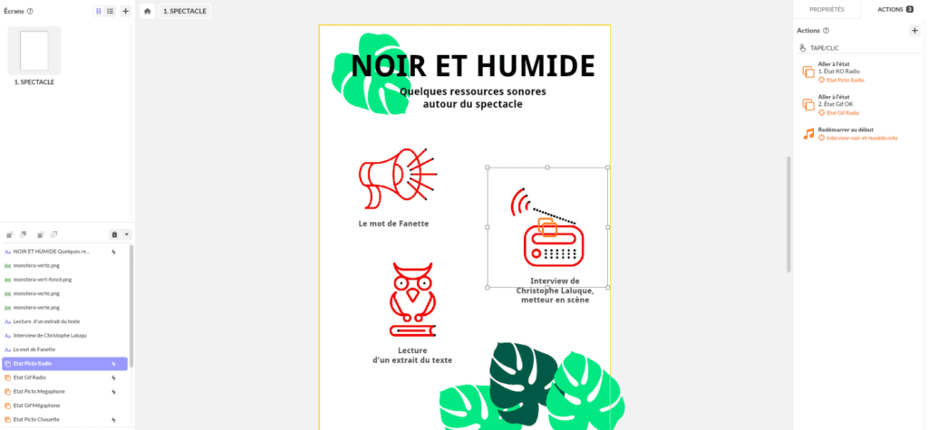 - des contenus sonores enregistrés en interne ou avec une radio associative proche du théâtre, Radio Grenouille, visuels simples et GIFS