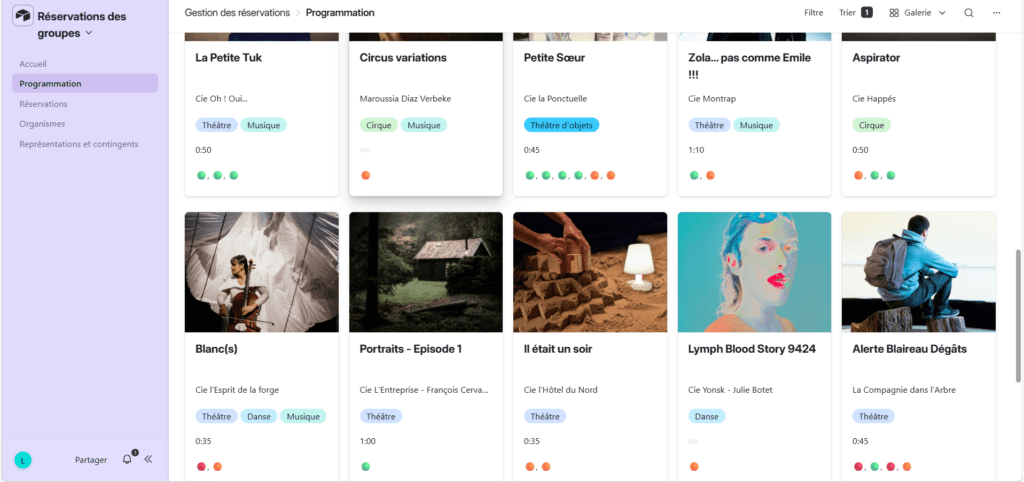 - la programmation (vue sur tous les spectacles de la saison et leurs informations)