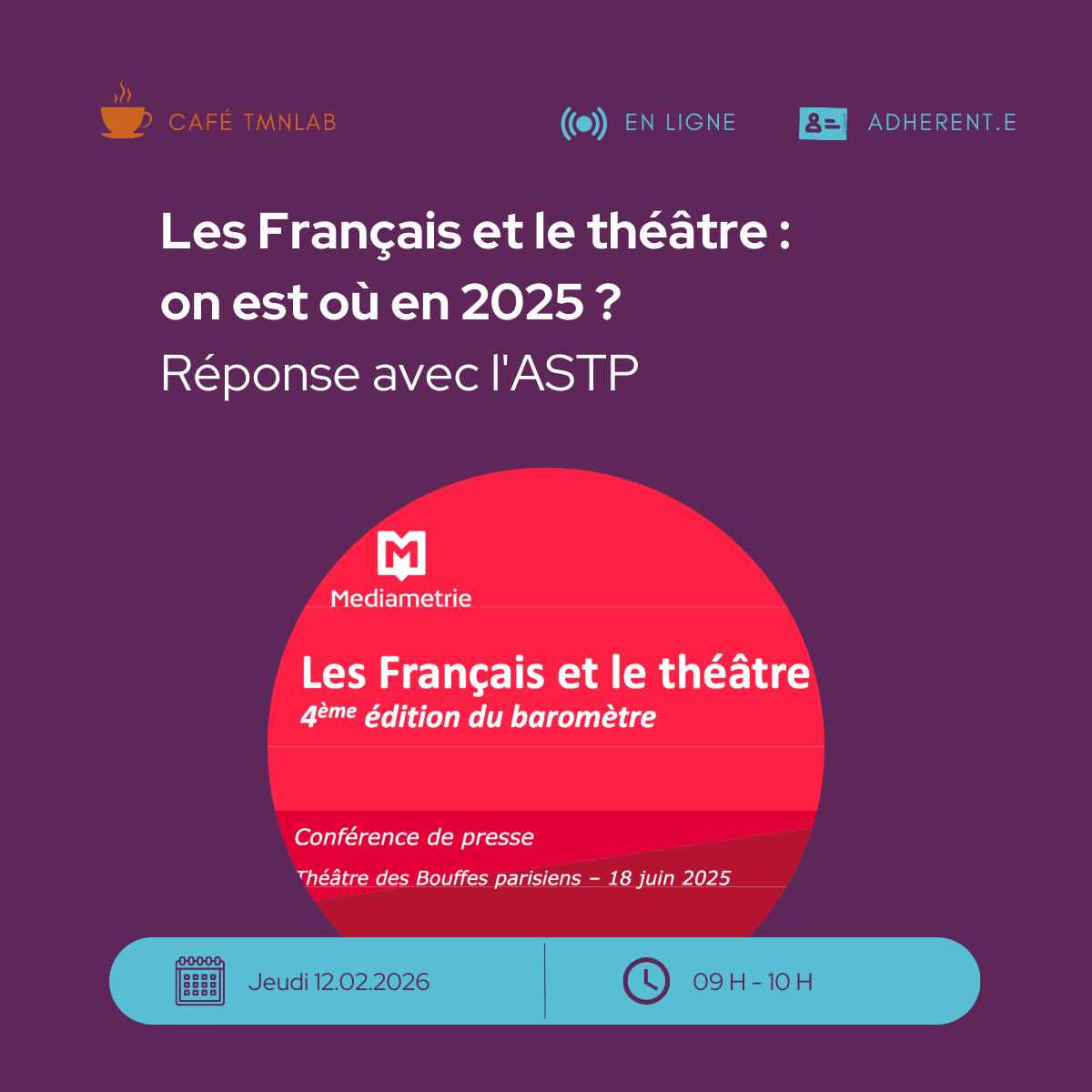Rendez-vous jeudi 12 février, de 09h à 10h, pour découvrir cette quatrième vague de l’enquête menée en avril 2025, et mettre à jour le profil et les pratiques des Français en matière de sortie au théâtre au cours de la saison théâtrale 2024-25.