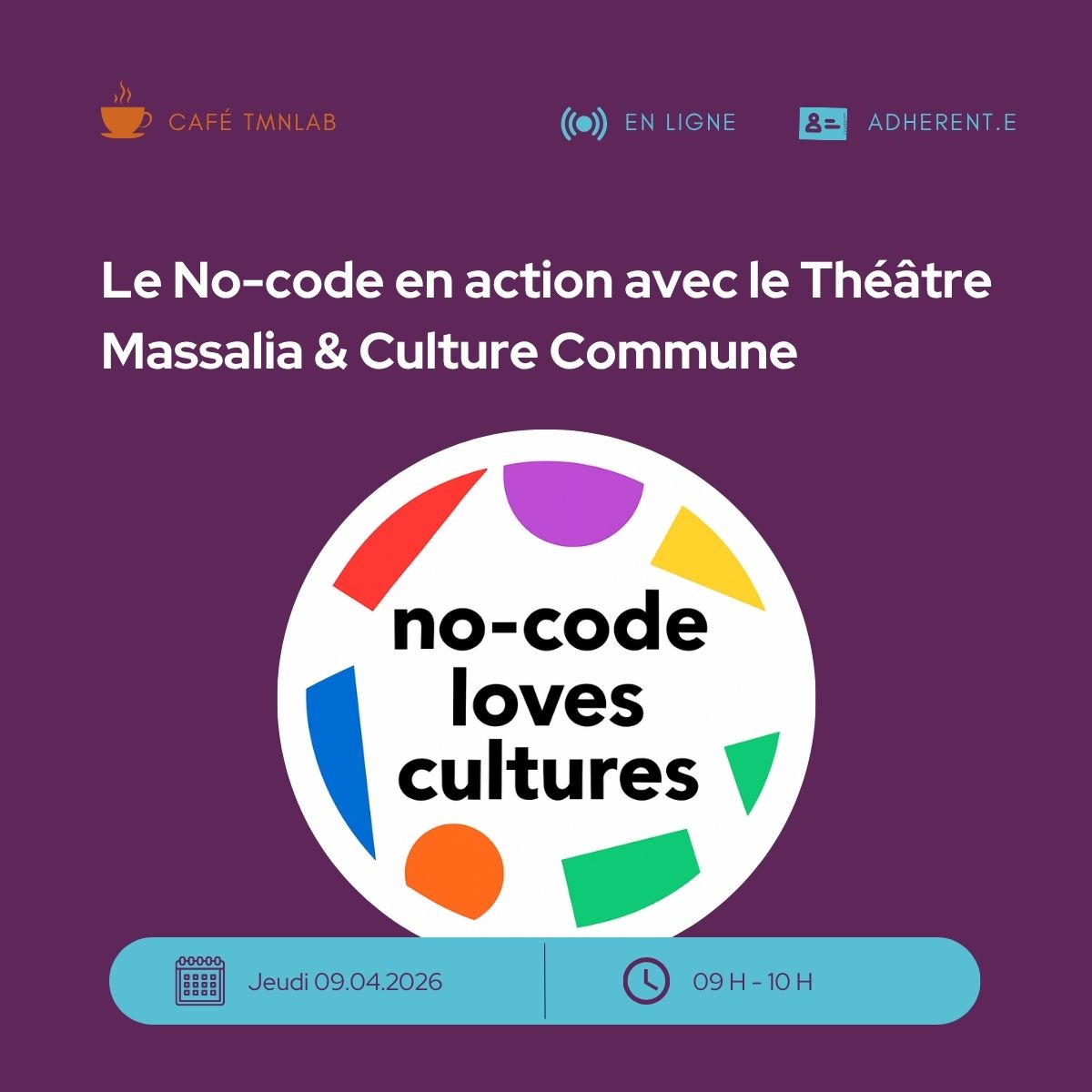 Pour ce premier café retours d’expérience le jeudi 9 avril, nous accueillerons, Camille Vautrin et Corinne Nobileau du Théâtre Massalia pour un projet de médiation in situ, ainsi que Culture Commune qui nous présenteront leur utilisation du no-code.